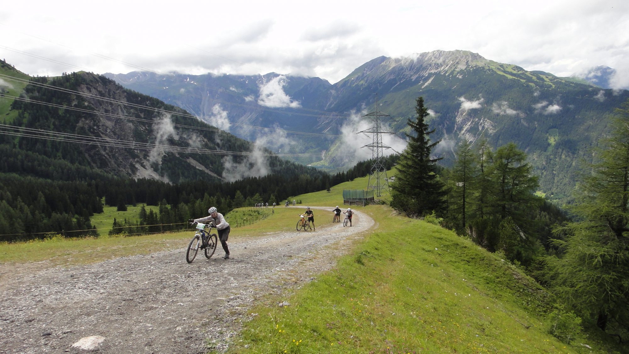 Von Ischgl aus machten wir uns dann auf zur dritten Etappe und auch hier sollten wir nicht ganz ohne technische Probleme auskommen. Irgendwann gab plötzlich Michas Schaltung doch wieder den Geist auf und so kam es, dass er nur noch auf dem großen Blatt hinten fahren konnte. Er treppelte sich also einen Ast auf kilometerlangen leicht abschüssigen Abschnitten und so kam es, dass plötzlich ich öfters vorne im Windschatten fuhr, mich aber auch immer wieder hinter ihn setzte um ihn anzuschubsen, bis ein netter Mitstreiter Mitleid mit uns hatte und sich dann vor uns beide setzte, so dass ich immer wieder von hinten kurz anschubste, um dann wieder hinter Micha und dem netten Mitsreiter in den Windschatten zu fahren. Immer wieder schön und unvergesslich sind solche Situationen, wo Teams und Mitstreiter einfach zusammenhalten.