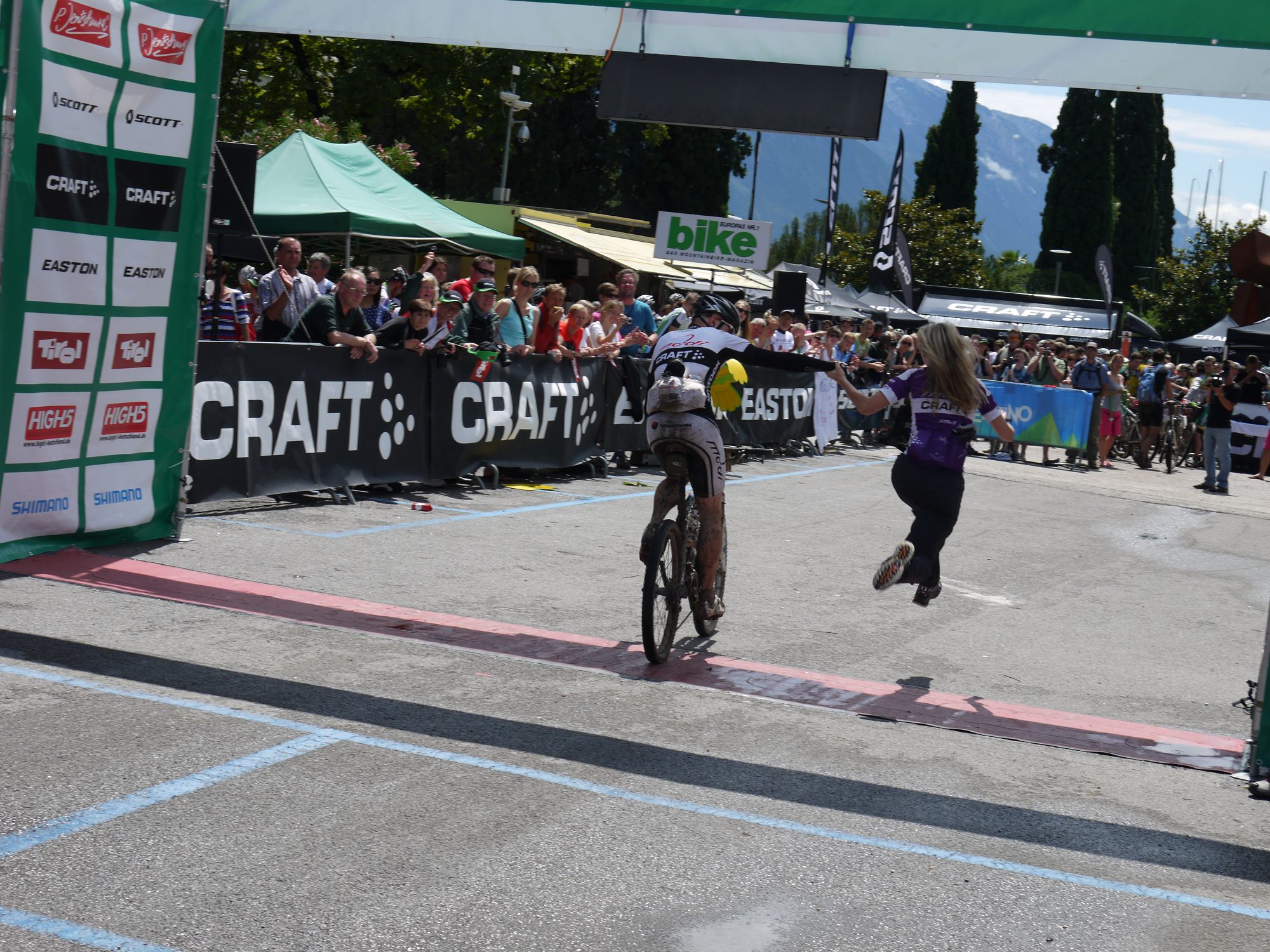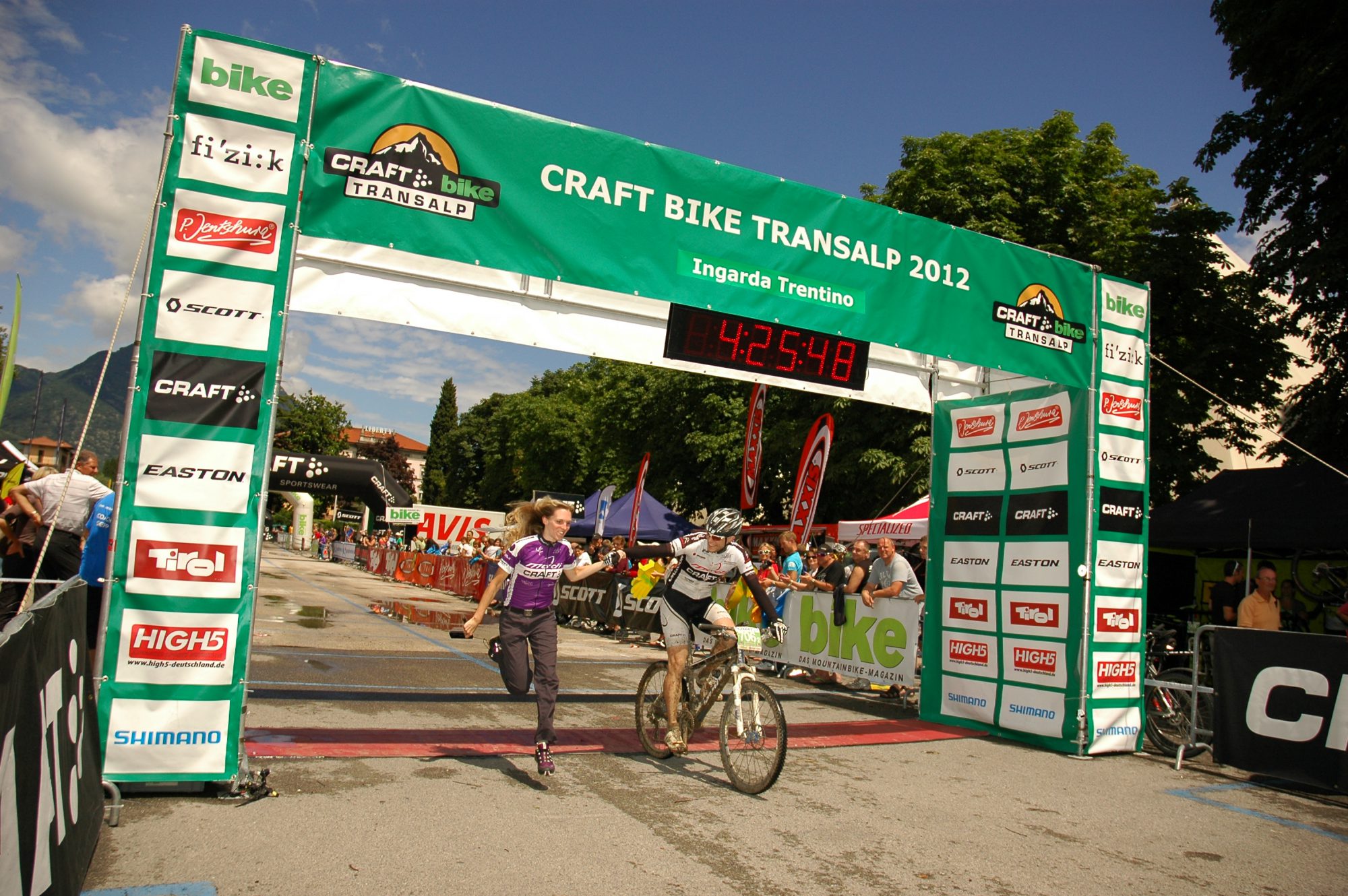 Der Schluss ist dann eigentlich recht schnell erzählt. Micha kämpfte sich die restlichen 3 Tage noch erfolgreich alleine nach Riva durch, hatte aber nicht mehr sehr viel Spaß dran, da wir eben einfach gemeinsam ankommen wollten. Ich musste noch 2 Tage warten bis mich Michas Bruder mit dem Auto abholen und nach Riva bringen konnte. Auf der Fahrt nach Riva gewitterte, stürmte, regnete es wie verrückt und im Auto sagte ich immer noch mit Bauchkrämpfen – irgendwie scheint alles gegen mich zu sein, dass ich in Riva ankomme. Nachts um 0:30 Uhr kamen wir endlich an und durften sogar noch im Hotel einchecken. Am nächsten Morgen warteten wir im Zielbereich auf Micha und als er anflog kletterte ich über die Absperrung und rannte mit Micha gemeinsam über die Ziellinie. Unser Zieleinlauf wurde sogar im Video der Transalp 2012 dann verewigt.
