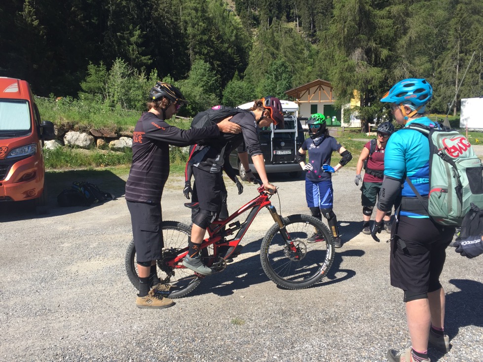 Na klar waren wir für eine Gruppe zu viele, also wurde kurzerhand eine zweite 4er Gruppe aufgemacht, die neben Antje Kramer und Steffi Telscher, von Raffa und von Vroni Widmann – die derzeit im internationalen Downhill Weltcup immer wieder in die Top 10 fährt- geguided wurde. Also reihten Chrissi, Heike, Eva und ich mich bei Raffa und Vroni ein und machten uns auf zur ersten Tour. Anja und Tina wollten erstmal nochmal ihre Fahrtechnik in der Gruppe 2 auffrischen. Tina wechselte dann am 3. Tag doch noch in die 3er Gruppe.