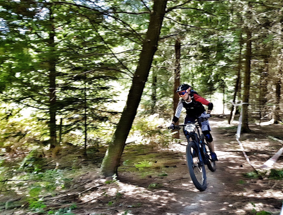 Und los ging es zur ersten Stage die direkt unterhalb des Veranstaltungsgeländes startete. Hier hieß es noch kurz anstehen bis wir auch hier im 30 Sekunden Abstand auf die Stage durften. Ich kam zumindest besser durch die Kurven als im Training, jedoch war das absolut nicht meine Lieblingsstage – unrhytmisch zirkelte ich durch Kurven und war nicht ganz mit mir zufrieden. Es folgten aber auch noch recht schöne Stages – alle technisch nicht zu anspruchsvoll – durch wurzelige staubtrockene Wäldchen. Am schönsten fand ich eine Stage, die mal etwas weniger kurvig dafür mit einem mini Hüpfer und geradeaus Strecken war, wo man auch mal ordentlich Gas geben konnte.